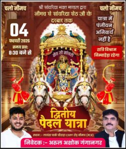 विगत वर्ष अनुसार इस वर्ष भी श्री सांवरिया सेठ मंडफिया तक की पैदल यात्रा 4 फरवरी 2026 बुधवार को सुबह 8:30 बजे प्रारंभ होगी।नीमच से लगभग 90 किलोमीटर दूर पैदल चलकर मंडफिया धाम पर आस्था का सैलाब पहुंचेगा।सांवरिया भक्त मंडल द्वारा जोर शोर से पैदल यात्रा निकाली जाएगी। इसकी तैयारियां लगभग पूर्ण हो चुकी है। इस वर्ष सांवरिया सेठ की पैदल यात्रा इतिहास रचने जा रही है।